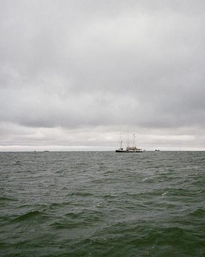 A wooden ship navigates the perilous waters of the Bering Sea. Bristol Bay, AK