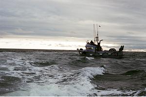 A Salmon Fisherman sets his nets at the mouth of the Naknek River. Bristol Bay, AK